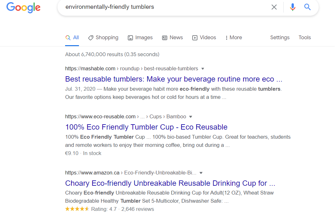 Using a search engine like Google is a great place to find direct and organic competitors. Simply plug in your primary keywords and scroll through the results. For example, if you sell environmentally friendly tumblers, put that into Google and see who else is on that top 10.
